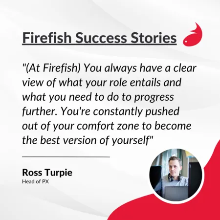 Ross Turpie has been with Firefish for over 7 years – and having started as a Recruitment Success Specialist in 2016, some of his next roles didn’t even exist at the time! Currently, he’s our Functional Head of Product Experience, managing a team of 5 and being the bridge between all things customer and product.
